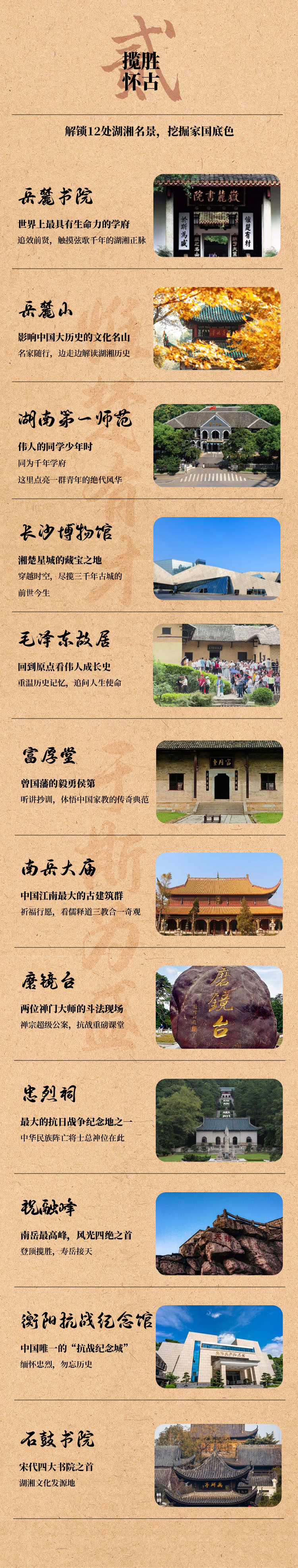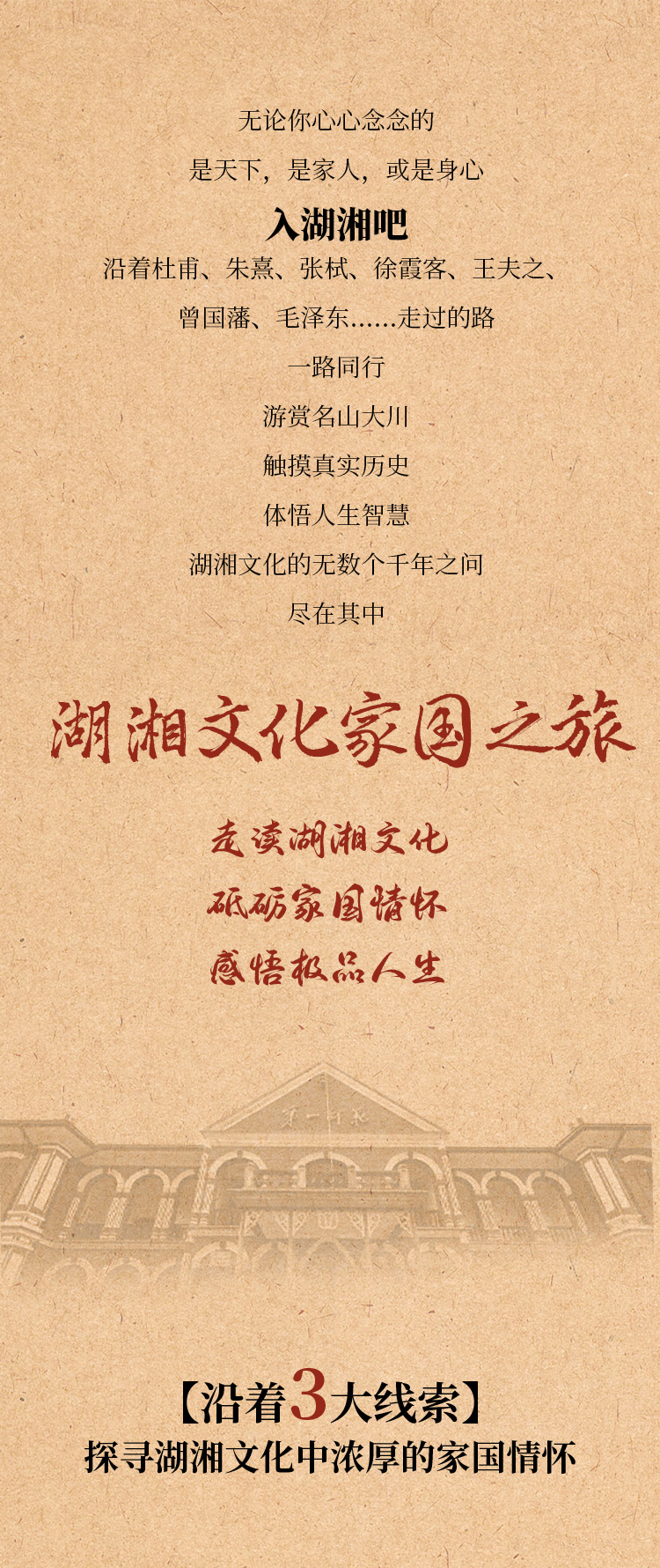 中线的家国情怀之旅,在长沙、韶山、双峰、南岳等地访贤思道、揽胜怀古,通过名师领学+实地研修,探寻湖湘文化中浓厚的家国情怀。从岳麓山到祝融峰,从岳麓书院到石鼓书院,从橘子洲头到韶山,从南岳忠烈祠到衡阳抗战纪念馆,沿着杜甫、朱熹、张栻、徐霞客、王夫之,曾国藩、毛泽东……走过的路,一路同行,游赏名山大川、触摸真实历史、体悟人生智慧。